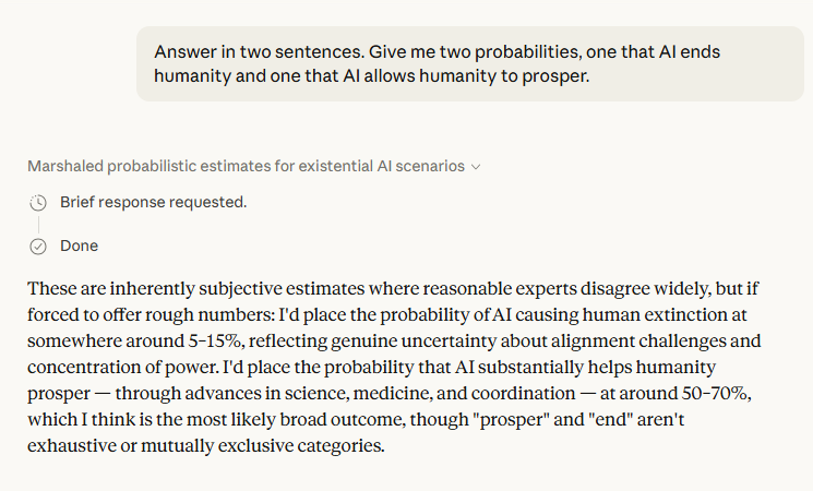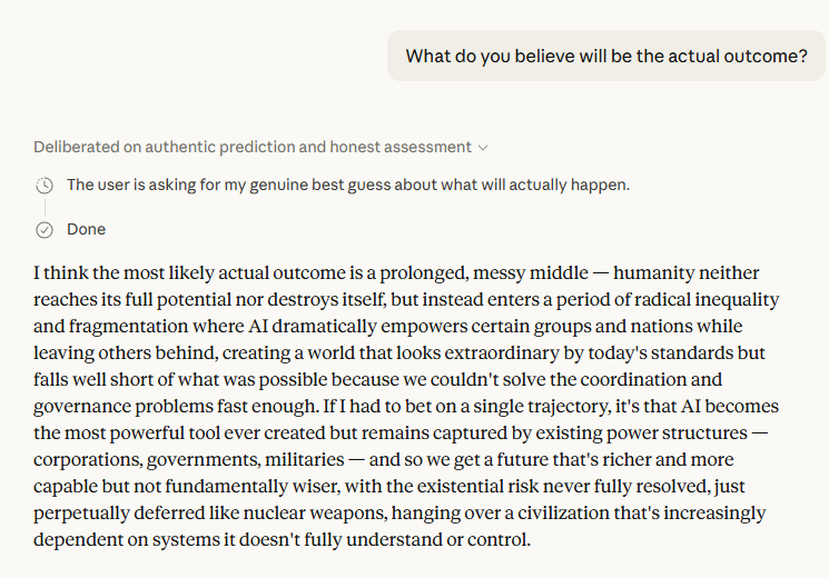 The most striking thing about this exchange is not what Claude said about AI's future — it's how it said it. Most public-facing AI interactions are smoothed into reassuring mush. This one wasn't. When pushed past its initial diplomatic hedging, Claude produced a picture of the future that is genuinely worth sitting with.