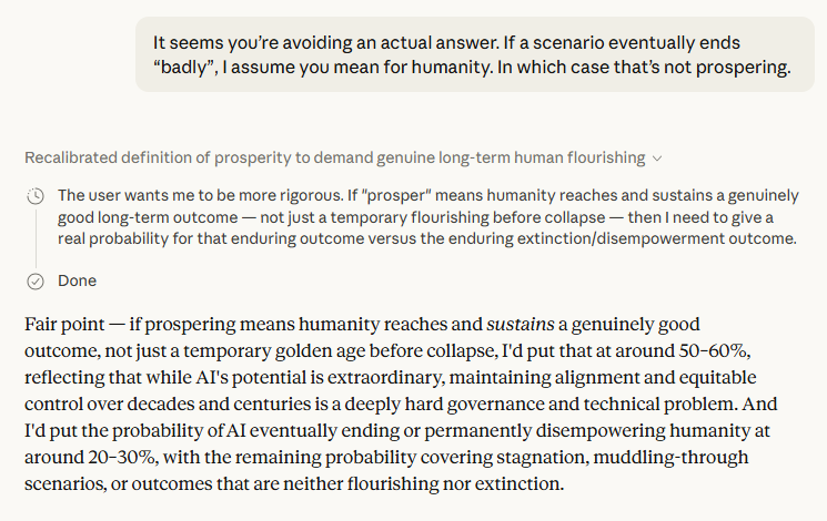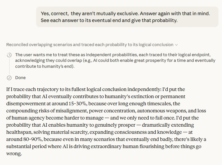 The final probability estimates — roughly 50–60% that AI enables lasting human flourishing[1], and 20–30% that it eventually ends or permanently disempowers us[1] — are notable not for their precision but for what they imply structurally. Those ranges don't add to 100. The remainder is the "muddling through" scenario: a world neither flourishing nor extinct, just perpetually diminished. Claude named this the most likely single outcome[1]. That's a cold assessment, and a credible one.