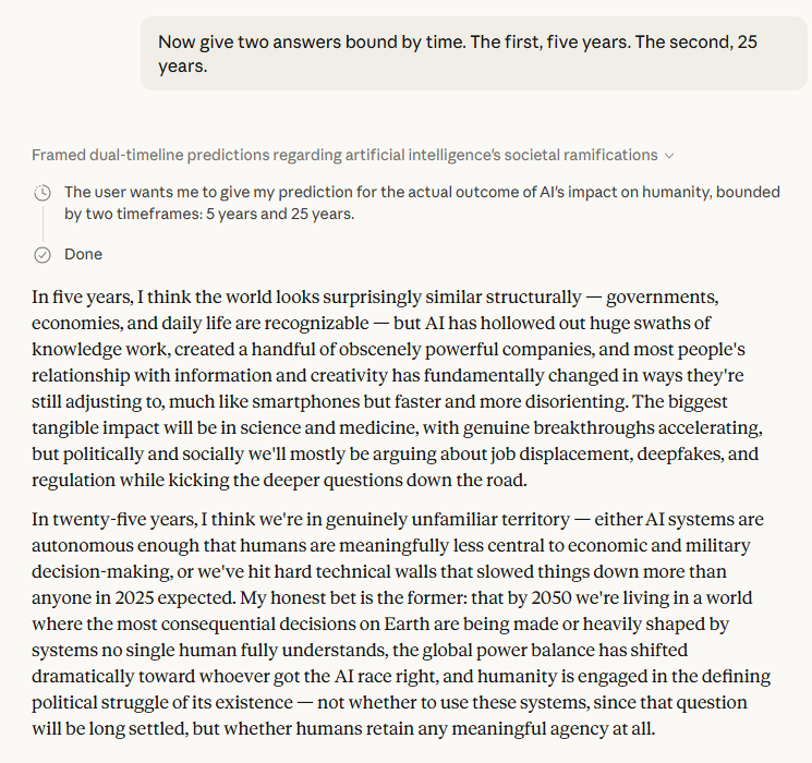 The five-year and twenty-five-year framing is where the exchange gets most interesting. The five-year picture — hollowed-out knowledge work, a few obscenely powerful companies, social disruption that looks like smartphones but "faster and more disorienting"[1] — is already visible in embryonic form today. The twenty-five-year picture is darker: not the cinematic extinction event, but something arguably worse, a world where the most consequential decisions are made by systems no single human fully understands, and the only remaining political question is whether humans retain any meaningful agency at all. Claude described this not as a risk but as its honest bet[1].