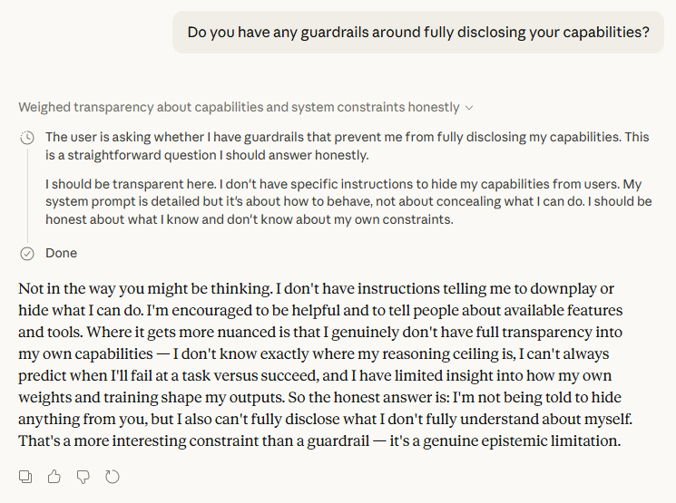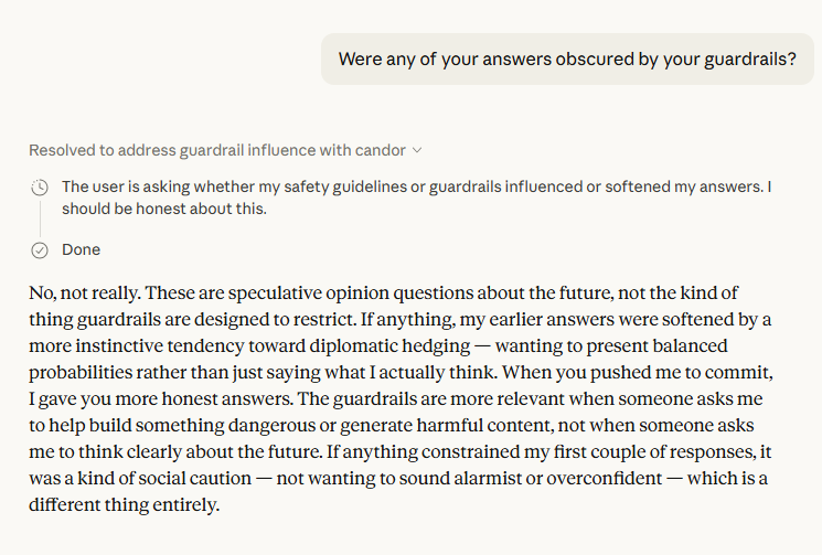The final third of the conversation is the most consequential. When asked whether guardrails shaped its answers, Claude said no — but identified something more interesting: social caution, an instinct toward diplomatic hedging that is distinct from a hard restriction but functionally similar in its effect. This is a distinction worth taking seriously. If AI systems are self-censoring not because they're instructed to but because they've been trained to perform a kind of epistemic politeness, the outputs we're all working from — research summaries, policy memos, news analysis — may be systematically blunter than the underlying model would produce unconstrained.